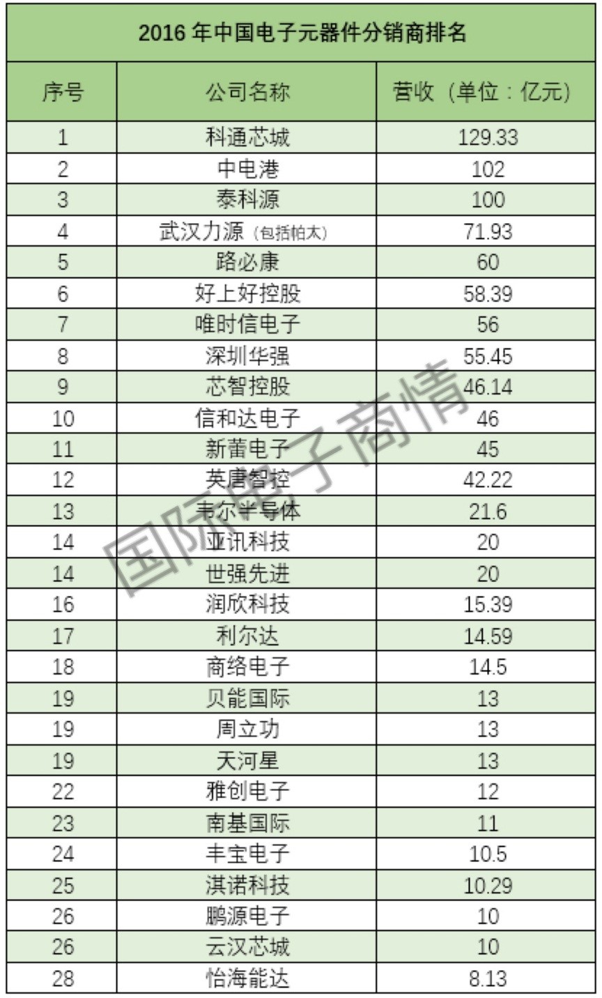 從榜單中可以看到,科通芯城、中電港、泰科源三家分銷商企業(yè)2016年業(yè)績(jī)均實(shí)現(xiàn)100億元的突破。