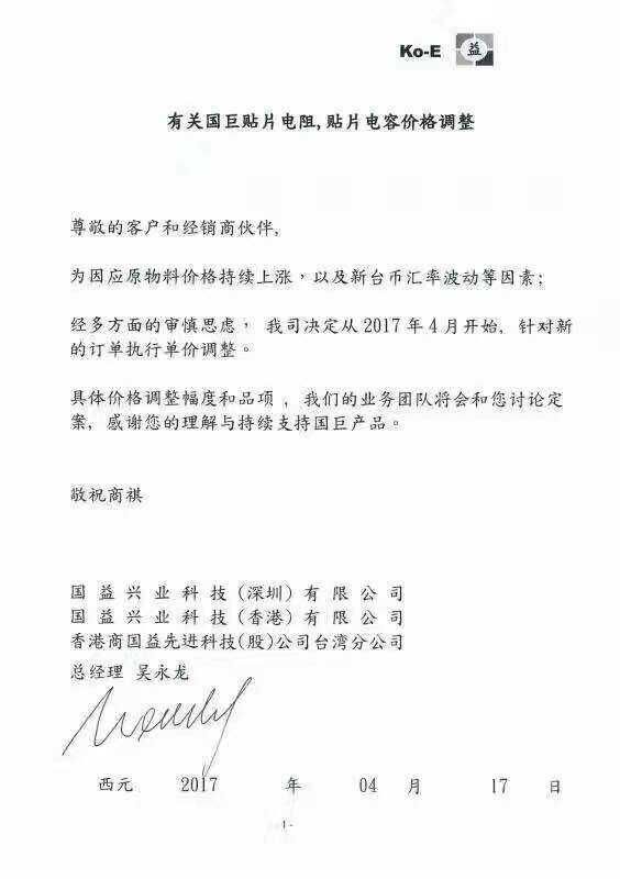為因應原物料價格持續上漲,以及新臺幣匯率波動等因素;經多方面的審慎思慮,國巨公司決定從2017年4月開始,針對新的訂單執行單價調整。具體價格調整幅度和品項,國巨公司的業務團隊將和客戶群體討論定案,感謝您的理解與持續支持國巨產品。
