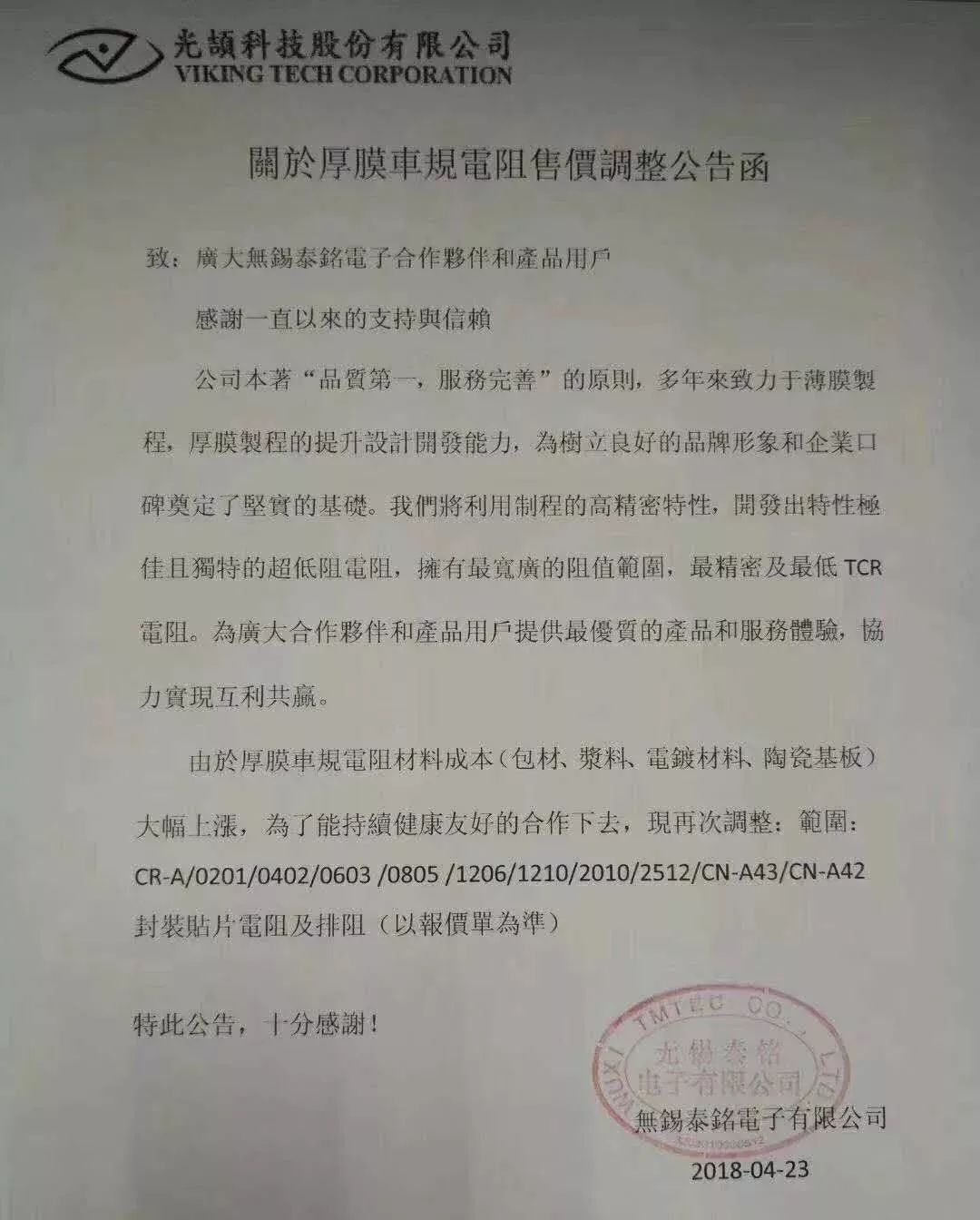4月23日,光頡科技再發(fā)漲價(jià)通知,由于厚膜車規(guī)電阻材料成本(包材、漿料、電鍍材料、陶瓷基板)大幅上漲,為了能持續(xù)健康友好的合作下去,現(xiàn)再次調(diào)整,范圍包括:CR-A/0201/0402/0603/0805/1206/1210/2010/2512/CN-A43/CN-A42封裝貼片電阻及排阻,具體以報(bào)價(jià)單為準(zhǔn)。這是今年以來光頡科技第四次調(diào)漲電阻價(jià)格了。