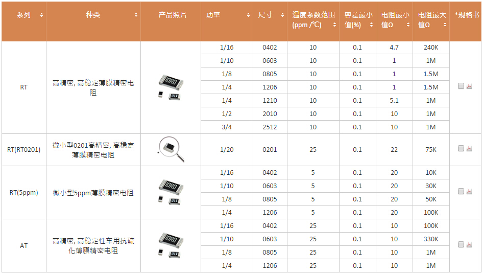 采用先進的濺射技術,國巨薄膜芯片電阻提供高精密度,高穩定性,±0.1%的窄公差和±25ppm/℃的低TCR。最小的尺寸為0201,最低TCR為±5ppm/℃。