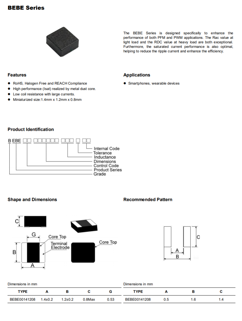 BEBE系列是專為增強PFM和PWM應用的性能。Rac值為輕載和重載時的RDC值都是例外。此外,飽和電流性能也是最優的,有助于減少紋波電流,提高效率。